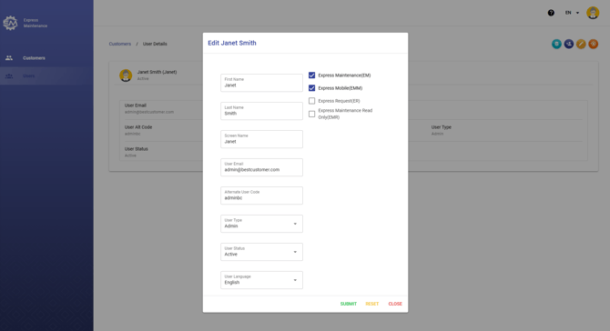 Edit: Admin users can also edit User Type, User Status, add, and delete rights to the user’s database setting. User databases must be in the Customer Database list to be available to be chosen for a user.